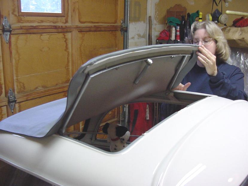 Oddly enough, the Isetta owner's manual makes no reference for the proper way to stash the sunroof when opened. The following sequence will help you quickly and easily open your hatch up and avoid having the sunroof material flapping in the breeze and flogging your paint job in the progress. Once you've done this a couple of times, you can do it in your sleep. Our lovely assistant is Dorothy Waite of Oak Harbor, Washington.